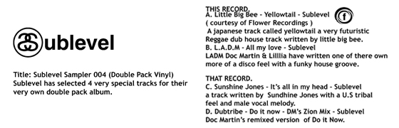 DOC MARTIN : Sublevelは音楽、サウンド、ライティング、アートワーク、スタッフすべてが愛によって作られているパーティなんだ。6週間に一度開催していて、いつもロフトとか倉庫、ボールルームとか映画館とか、クラブではない場所で開催しているんだ。ゲストは常に音楽的に何かを与えてくれると感じる人だけにお願いしている。過去にはDennis FerrerやSunshine Jones, Paul T, Jeno, Garth, Craig Richards, DJ Mochizukiなどに参加してもらっている。いつも朝方に向けていい感じになるのが特徴かな、新年のパーティでは12時までプレイしたんだ。Good Vibes+ Great people= Very good Partyだね。