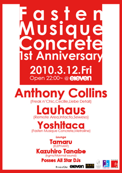 昨年はボートパーティー、ビーチパーティー、ラウンジスタイルフリーパーティーなど多様な切り口と斬新なアイデアで東京のシーンに新たなスタイルを提案した Fasten Musique Concrete。今回、話題の新ヴェニュー eleven にて行われるアニバサリー・パーティーでは、ロンドンと東京で過去2回にわたり Fasten Musique Concrete に出演している Anthony Collins と、アムステルダムを拠点とする話題の新星アーティスト・Lauhaus を招聘することが決定。当パーティーのレジデント・Yoshitaca との共演に期待したい。