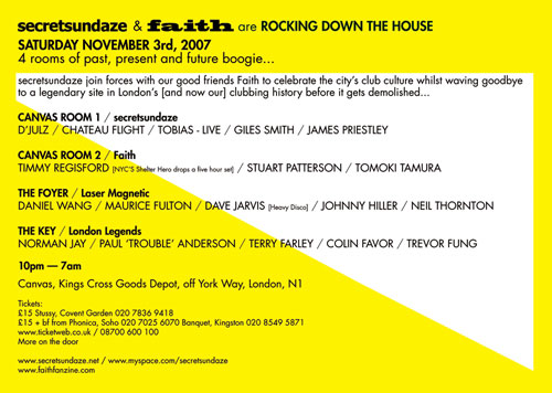 今週土曜日にロンドンの最重要パーティー Faith と Secretsundaze が、鉄道工事のために残念ながら今年一杯でなくなってしまう Kingscross の The Key, Cross, Canvas を惜しんでのイベントを開催するとのことでお知らせしたい。