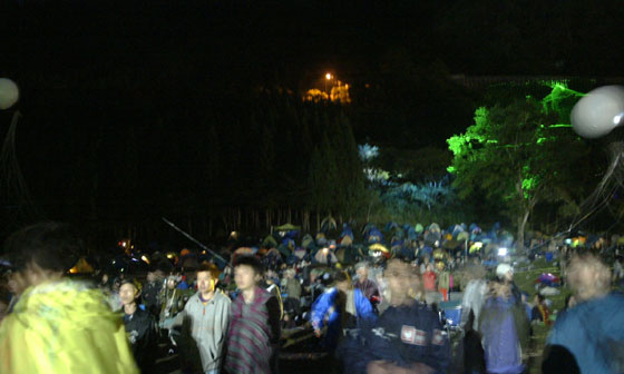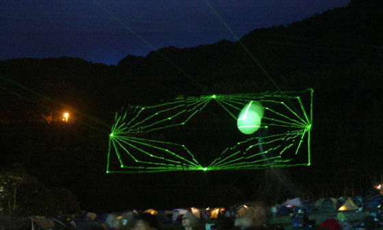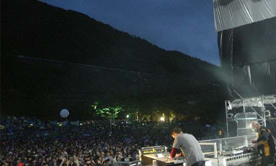 8月最後の週末に開催された。今回は、例年通りのSOLARとLUNARステージのほかに、ドイツ/ベルリンの名門レーベル"!K7"によるステージが加わった、3ステージに渡るプログラムが組まれており、そのラインアップにも一層の磨きがかかった感じである。 HRFQにとっては、7月末に行なわれた"FUJI ROCK FESTIVAL04"から約一ヶ月ぶりの苗場入りとなったのだが、会場行きのバスと降りたとたん、一ヶ月前と格段に違う温度差にびっくりさせられてしまう。しかも、この小雨交じりの肌寒い気温が、スキー場周辺の寂しい"シーズン・オフ"な雰囲気を際立たせているような感じ。まだ昼過ぎなのにである…。とりあえず、気を取り直して会場へと向かう。入場するとまず目に入ってきたのはSOLAR STAGE前に設置された大きな白い三つの風船。SOLARだけに、太陽をモチーフとしたデコなのだろうか、夜になったら良い演出をしてくれそうだ。LUNARステージと!K7ステージに挟まれるかたちである屋台村には、これからの長い夜に向けて"体力は温存しておこう系"のクラウドが集まっていて、彼らの個性的でありながらオシャレなファッションや、イベントの楽しみ方が、ロックイベントとは違う夜の雰囲気を醸し出していた。 | |