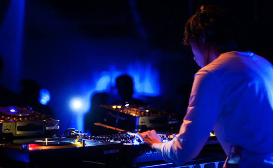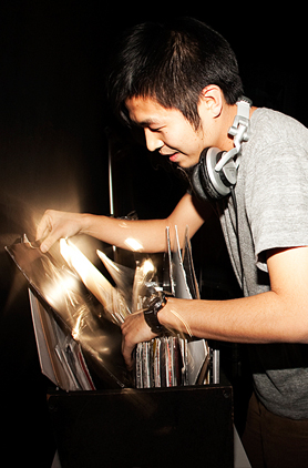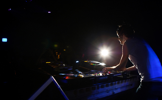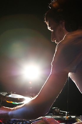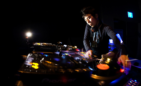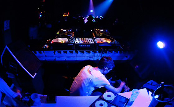 そんな私の気持ちとシンクロするように、フロアも熱を帯びていき、叫び声やDJを煽る黄色い声が幾重にもこだまする。ダンスする足下がゆらゆらと煌めいて、ストロボが光る度に、「やられた感」 を纏った笑顔がフロアに浮かび上がる。歓声に沸く、恍惚の渦の中で、パーティーフリーク達に見守られながら、Jan から yone-ko へとグルーブを繋げていく。 ハットとキックの間を行き来しつつ、変態的な、フレーズやボイスサンプルのあるトラックを挟んで、ゆっくりと、緻密に、繊細に、グルーブを練り上げていく。音の行く先を追っていくと、知らぬ間にすごい深い領域までハメられていて、抜け出せなくなってしまう。もうすごいところまで来ちゃったな、もう無理だなと思った瞬間にいい塩梅でヌケる部分を作ってくれる。そのやり方が本当に抜け目がなく、絶妙で、完全に彼の術中にはまってしまう。極限までミニマルなDJスタイルであることが、最大限にグルーヴィーであることの証明であるかのようなプレイ。ミニマルでありながらも、多様なカラーの音世界に旅させてくれ、中毒性のある、ヒプノティックなプレイに舌を巻く。 | |