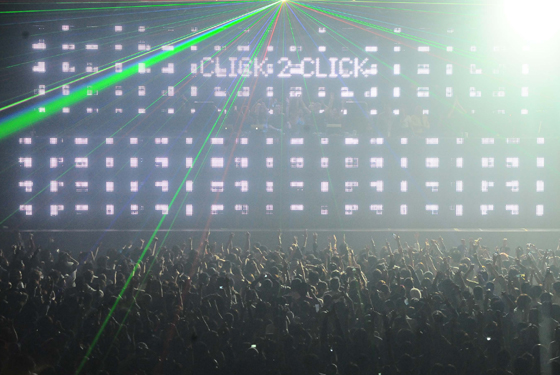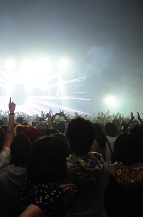 WOMB WORLD WIDE Area に戻ると、まさにラスト・スパートと言える Josh Wink のプレイが続いていた。 かなりハードな展開で爆発を繰り返すオーディエンス。反面、Click 2 Click の登場を待つそわそわした空気が 「ビッグ・フェスだなぁ」 と楽しみつつ、いよいよ Click 2 Click の登場だ。 ブースへ現れた Richie Hawtin & Dubfire を前に奇声を上げるフロア。古くからの友人であるという Josh とのハグを交わし合うビッグ3の光景は、まさに贅沢そのもの…!こういったイビザ / マイアミのようなシーンをみせてくれるのも WOMB ADVENTURE ならではの楽しみかもしれない。 長いタメの後に繰り出される強固なキックで、ついに Click 2 Click のプレイがスタート。 巨大フロアは大いに爆発し、昨年の "CONTAKT" とは違ったアップリフトな幕を切った。 先日のインタビューで、 「Richie との Back to Back はとりわけ 『自然』 な感じに思えるんだ」 と Dubfire は語っていたが、まさにその通り。すごくナチュラルなテクノがそこにはあった。といっても、決して 「普通」 なのではなく、2人のセンスが見事に融合されたオリジナルのグルーヴと、ラップトップを同期させてこその反則的な音の抜き差しがスパイスとなった、全く斬新なサウンドを生み出しているのだ。誰でも踊れるようなサウンドだけれども、未来的でアンダーグラウンドな後味…。まさに 「Future & Nature」 と言える同フェスのコンセプト通りなショウケースに成功したのではないだろうか。 ラストはアンコール鳴り止まぬ熱気だらけの状態。 昨年に第1回目を迎え、本当の意味での挑戦となる今回も成功した WOMB ADVENTURE は、今後の発展を確信させる大きなポテンシャルを残しつつ、壮大なフィナーレを迎えるのであった。 | |