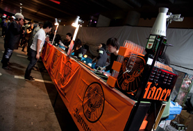 そんな期待を胸にオープンから2時間後辺りに会場入りした筆者であるが、まず驚いたのが WOMB WORLD WIDE Area での巨大LEDスクリーンだ。前回の Ali.M.Demirel によるアーティスティックなものとはまた違った、 ダンサブルで心臓を揺さぶるような光の展開はまさに圧巻の一言。タイミングよく降り注がれるレーザー・シャワーの演出も WOMB ならではで、すぐさま 「踊りたい!」 という衝動に駆られてしまった。 それに負けじとブース映えしていたのが Josh Wink なのだが、一聴して 「調子がいい!」 と思わせる輝きのサウンドを展開中。 Ovum 的なテック・ハウスをベースにエッジーなテクノを斜め角度からドロップ。得意のループ・テクニックを次々と披露し、発狂していくフロアをダークなミニマルで一気に落とす…。ダークなシーンでこそ輝く Josh の笑顔は、まさに絶好調の証そのもので、有り難さすら感じてしまった。中盤は懐かしの名曲 Joris Voorn の 'Incident' や、自身のアシッド・アンセム 'Don't Laugh' なども投入してくるというサービス旺盛な場面もあり、まだまだ浅い時間ながら会場は大きな盛り上がりをみせていた。 一方、KITSUNE Area の方は、 レーベルの創始 Gildas & Masaya がプレイ中。直球のエレクトロ・トラックをベースにニヤリとさせるサンプリング・ネタや激しいエフェクターさばきで、こちらも大いにフロアを沸かせていた。 また、前回にも増して映像が効果的に演出され、Kitsune サウンドに相応しいポップな色使いのヴィジュアルがエレクトロ・サウンドと完全にシンクロ。WOMB WORLD WIDE Area とはまた違う、良い意味での縦ノリ空間がバラエティ豊かなオーディエンスを乱舞させていた。 しばし休憩のため、フード・ドリンクエリアへ。思わず目移りしてしまうほどの、幾銘柄ものバーが立ち並び、またフードも和洋さまざまなものが提供され、ヒーターが側に置かれた座席で快適に過ごすことができた。 | |