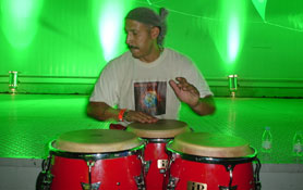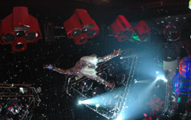まず注目のデコレーション。今回は海底都市がテーマと言う事で、アリーナではクラゲやエイを模したオブジェが天井から吊るされ、全体的に青色を貴重とした照明の下、確かにクラウド達が魚に見えてしまうようなクールな演出がなされている。一方のテントの方では、海中の映像がスクリーンに映し出される中、たくさんのシャボン玉が宙を舞い、アリーナがディープ・シーであるとすれば、こちらは浅瀬といった雰囲気を醸し出す演出。「最近こういったコンセプチャルなイベントも少なくなったなぁ」と思いながら、会場内をグルグルと周り、さっそく自ら回遊魚状態になる。 アリーナの方では既にLouie Vegaがプレイをスタートしており、彼の繰り出すステディでピースフルなハウスミュージックに、緩やかなカーブを描きながらもフロアは徐々にヒートアップ。爆音でもなければ、「音が小さいな」とも思わせない、微妙なさじ加減でフロアの雰囲気を作り上げていくその感性とスキルはまさに神業で、「ハウスミュージックってこんなにいい音だったんだなぁ」と改めて感動を覚えるほどであった。 |