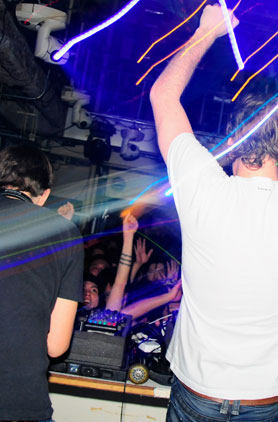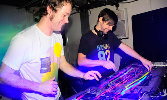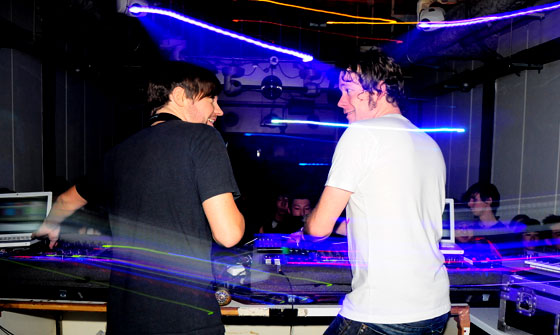 オープニングはフリースタイル・ダウンビートを得意とする Sebastian こと Seb が担当。海の中を漂っているような心地よいサウンドでフロアをゆっくりと温めていく。チルアウトレーベル Chillosophy Music のA&Rであり、また Ooze 名義でも活動を行っている Seb ならではの幅広い選曲で早くもオーディエンスの心を鷲掴み。スタートして30分も経たないうちにフロアはすでに満員状態。ダウンテンポなセットが多い Seb だが、フロアの盛り上がりを見てビートを少しずつ増やして行き普段の Seb からは想像できないようなフロアーライクなダンストラックの連続でオーディエンスを驚かせた。一方 Marcus は日本にくる前から体調を崩しており一時は大阪行きも危うい状態だったが、前週の東京 UNIT でのギグ終了後から一週間ゆっくりしたことで随分体調も回復したようで、Seb がプレイ中にはフロアに出て来てオーディエンス??と一緒に Seb の音を楽しんでいたようだ。 フロアがすし詰め状態となった2時半頃、Marcus がステージに移動し機材を弄り始める。しかし Seb はDJをストップする気配はゼロ...。「いつライブがスタートするんだろう?」と思いきや、Seb がDJしている傍らで、Marcus がライブ開始というシームレスなテクニックで気がつけば既にライブをスタートさせていた様子。この2人とってはあくまでもライブも長いサウンドジャーニーの通過地点でしかないということなのだろう。繊細なサウンドでフロアを焦らし、さぁ今からが本番!というところで、「ブチッ」という嫌な音が...。ライブ機材の電力が大きすぎて、変圧器がオーバーヒートしてしまったようだ。即座にクラブのスタッフがステージに駆け寄りライブ再開を試みるも、変圧器の修復が不可能なことが判明。急いで新しい変圧器を手配することに。しかしそこで焦りを見せることなく、今度は Marcus がDJをスタート。お得意のアップリフティングなテクノで、ライブの序章だけを見せられ欲求不満状態のオーディエンスをフロアにしっかりロックさせた。先日まで寝込んでいたとは思えないほどパワフルなプレイでフロアはますますヒートアップ、Seb のダンスセットとはまた違った彼特有のグルーブ感たっぷりな世界を作り上げて行く。音の趣向が違うこの2人が一緒に創り出すサウンドだからこそ、Minilogue は幅広い音楽ファンに愛されているのだろう。 | |