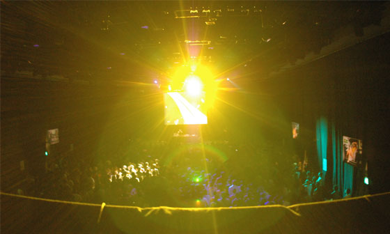 そのころLabの方では、HIFANA見たさのために長蛇の列が出来、そしてついに「入場制限」という事態に!WIRE 04のときのRYUKYUDISKOのショーを思い出すが、やはり最先端で活躍している日本人アーティストに対するファンの関心の高さは並々ならないものがあるのだろう。プレスパスを持っていたが弱気にも入場をあきらめ、しばらくフロアの各所を見て回ることに。今回のSonarでは、特に機材メーカーの出展が多く、i-Podやシンセサイザー、それに音楽制作系のソフトなどのプレゼンテーションが多数行われており、大勢の人が実際にソフトを触ったり説明を受けたりしていた。こういったプレゼンテーションをきっかけに、ダンスミュージック(とは限らないが)の制作に興味を持つ人たちが増えるというのはとても良いことだなぁ、などと思いながら、筆者自身も機材オタク熱が突如として湧き上がり、しばし最新のソフトをいじり倒して時間を過ごす。 しばらくすると、階上のメインフロアではChicks on Speedのショーがスタート。カラフルな衣装(というか布切れ)を身にまとい、顔や腕に蛍光塗料を塗りたくった3人がCOSのテーマと共にステージに現れる。"99 Cents"で幕を開けたショーは、ヒット曲の"We Don't Play Guitar"、そして彼女たちが影響を受けたといわれるTom Tom Clubの"Wordy Rappinghood"のカバー、"Fashion Rules"などを含む全9曲がプレイされ、途中編み物をしたり新聞を破いたりと、シアトリカルというか何というか、とにかく派手なアクションが印象的なセットを披露してくれた。 | |