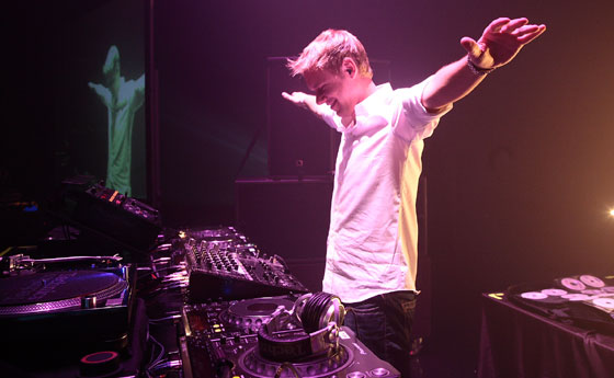大きな盛り上がりを見せた後も彼は流れを崩さずに滑らかに起伏を作りながら徐々に激しいサウンドへとシフトしていき、グルーブに少しずつアシッディなサウンドが差し込まれ、疾走感が増してゆく中、ドロップしたのは John Digweed のユニット Bedrock の大ヒット曲 'Heaven Scent'。 これには会場内も大盛り上がり、アリーナ中がはじけ、あの印象的なシンセリフが鳴り響くなか、イビサの空港に降り立つジェット機の映像が映し出され、本人も満面の笑みで両手を広げる飛行機のパフォーマンス。そんな中観客が盛り上がらないわけはなく、ますます勢いを増していった。 その後も音と映像がリンクしたパフォーマンスは冴え渡り、女性のボイスサンプルが印象的な楽曲ではそのボイスサンプルと完全に同期して映像モニターに歌詞が映し出され、映像と音で作り出されるブレイクも披露。ボイスサンプルと歌詞が同期しリフレインする中、ビートがやんでゆき、ボイスサンプルと歌詞だけに。ここの演出効果はすばらしくVJとDJが別々にプレイしている状況ではなかなか作れない演出だったといえるだろう。随所に映像も絡めた演出を見せながらパーティーを盛り上げてゆく彼の手法を見ていると本当に ageHa のような大きなサイズの会場を演出するのに慣れているなと感じた。彼はその後も観客の盛り上がりに答える華やかなプレイを展開し、観客もそれに負けじとラストまでとどまることなく盛り上がりを見せていった。 |