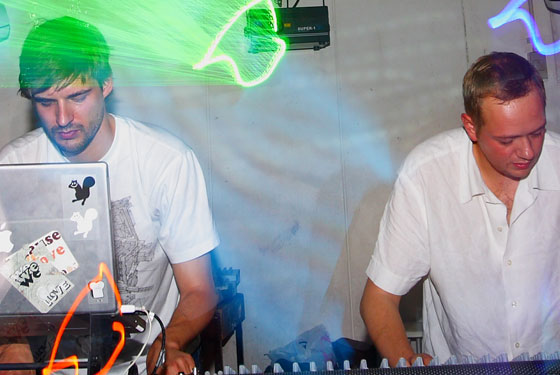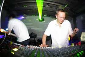 そして3時半、Extrawelt の2人がステージに登場。彼らのライブを今か今かと待ちわびていたオーディエンスから自然と歓声が上がる。Kunimitsu のアップテンポなテクノから一変し、デビューアルバム "Schone Neue Extrawelt" の1曲目 'One Tree Hill' でライブがスタート。ダークで幻想的なトラックは、今から始まる Extrawelt のサウンド・ジャーニーをスタートするのにピッタリだ。地を這うような低音、高い天井から降り注ぐ高音、そして時折入るノイズサウンドが右へ左と駆け巡る。Extrawelt 独特のサウンドに早くもオーディエンスは陶酔状態。新曲が2、3曲続いた所で、早くも彼らの代表曲とも言える 'Titlehead' をドロップ。The White Strips の 'Seven Nation Army' のサビの部分をサンプリングするという粋なアレンジも入っており、フロアーは狂気爛漫。'Soopertrack' や 'Drehfehler' 等の初期のシングルを織り交ぜながら新曲を中心に Extrawelt ワールドを創り上げて行く。Extrawelt とはドイツ語で 「第2の世界」 という意味を持っており、他の世界に迷い込んでしまったかのような感覚に落ち入ってしまう。PsypnoTek Project の四方八方に広がるレーザーも合わさって、「音の世界」 と呼ぶに相応しい空間が出来上がった。'Fernweh' でライブは終了するはずだったが、オーディエンスの熱いラブコールにより、予定には入っていなかった '8000' をプレイ。朝の5時とは思えない盛り上がりを見せた。デビュー当時から彼らのライブを見続けている著者だが、今回ほど密度の高いライブを見るのは初めてだった。今後の彼らの活躍に増々期待したい。 | |