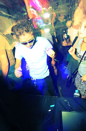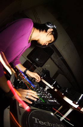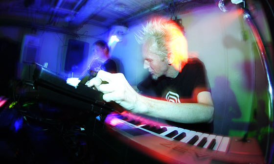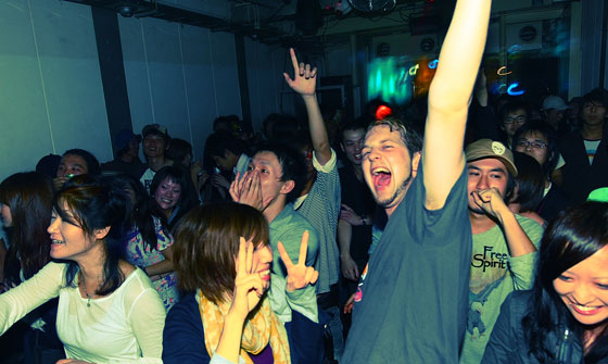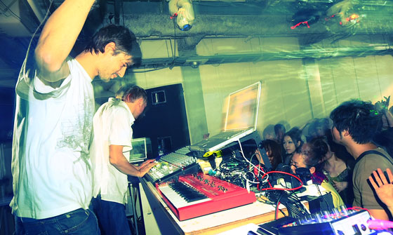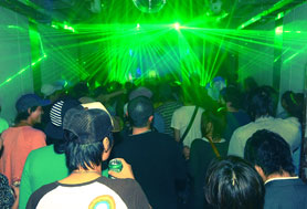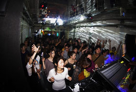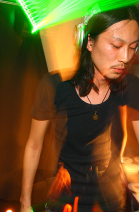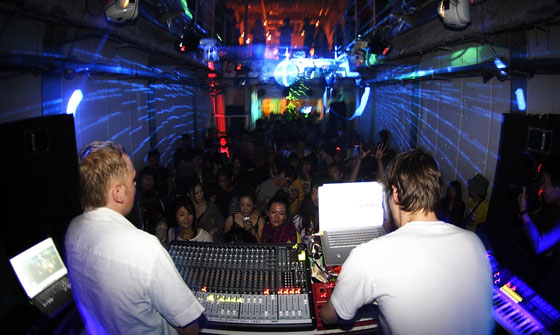 ゲスト・アーティストが2組ともライブセットということもあり、3階メインフロアにライブ・ステージを、4階メザニンフロアにDJブースをセッティング。そこに巨大ミラーボールやレーザーまで投入され、醸し出す雰囲気からもスペシャル感がヒシヒシと伝わってくる。ハウシーな Yasuhisa、少しハードなテクノの Naoya Sugimoto に続き、東京の渚でのステージを終え、その足で大阪へ駆けつけてくれた Pitch Black の2人が1時頃ステージに登場。ダブをベースとした重厚&アシディーなメロディーは、ゴアトランス世代の著者の琴線に触れる懐かしいサウンド。 「人間のDNAにはトランスに反応する物質が含まれているはず」 という著者の考えを裏付けるかの如く、先ほどまでミニマル・テクノを楽しんでいた若者たちの体も自然に動いてる様子。トランスのみならず、ハウスやテクノ、ブレイクスなど様の様々な要素が組み合わされた 「エレクトロニック・ミュージック」 を堪能することが出来た。機材の調子が悪く、彼らの最大の魅力であるビジュアルとサウンドのシンクロは体験することは残念ながら出来なかったが、音だけでも十分満足出来るクオリティーの高いセットを披露してくれた。 | |