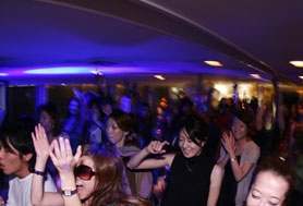 筆者が2階に戻るとこちらも CrossMountain レジデントの Dr Shingo が登場。普段のプレイよりも開放感のあるストレートなグルーブの楽曲を中心にプレイ。このさわやかなサウンドが白い造りの船と雲がかった外の景色にマッチしていていて、筆者も友人とデッキで談笑しつつ、そのプレイに耳を傾けた。 ひとしきり楽しんだ後、1階に降りると自身がレジデントを務める TRES VIBES を中心に活躍著しい Satoshi Otsuki 氏がプレイを開始。好調な彼らしく、場を上手にとらえたグルーヴィーな選曲でフロアもいよいよあったまった雰囲気に、グルーブをキープし、フロアを流れに乗せていった。このころになるとパーティー参加者もこなれてきたようで、フロアで踊る人が増え、盛り上がりを増していった。楽しく踊る人たちに混じって筆者も彼のダンサブルなセットを楽しんだ後、もう一度2階へ、そこではいわずと知れた人気ドラムンベースパーティー 06S を牽引する DJ Aki が丁度プレイを開始するところだった。夏に発売したミックスCD “mimo2” を彷彿させるようなライトなサウンドからスタートし、軽快に躍らせつつ、徐々に勢いを増していき、パーティーはどんどんとクライマックスへ。ハリのあるグルーブで躍らせながら要所要所で歌ものをドロップし、パーティー感満載のプレイを展開。両手を広げて楽しそうにプレイする姿に観客も大盛り上がりで答え、その勢いは最後まで衰えることなく船の到着まで続いた。 船から降りると、外の空気も涼しく、今回新しい試みとしてクルージングパーティーを体験させてくれた Womb に感謝しつつ、すがすがしい気分で船を後にした。 | |