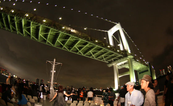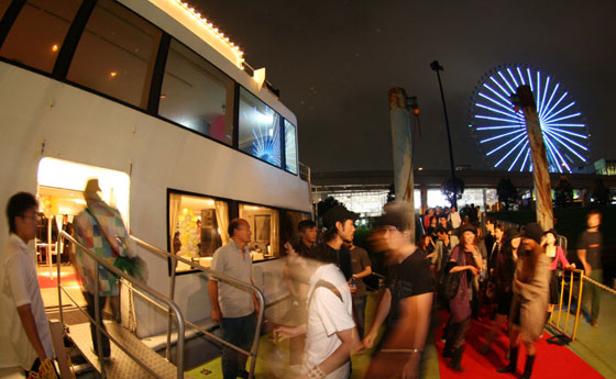 渋谷の店舗以外にも WOMB MOBILE PROJECT を開催するなど、これまでもシーンに斬新な話題を多数提供してきた Womb が、クルージングパーティーを開催するとのことでいったいどのようなパーティーとなるのか期待しつつ、 Sunset クルーズと Night クルーズの2部構成となっている前半の Sunset クルーズに参加させていただいた。 出発場所となっていた青海に着くと、発着場にはすでにパーティーの開始を待ち構える人たちが思い思いに過ごしていて、普段とはまた違った雰囲気が新鮮に感じられた。特に目を引いたのは女性客のファッションで、いつもとはまた違ったロケーションでのパーティーということもあり、ドレスなどを着ている人も多く、その華やかさはやはりファッションを思いっきり楽しめる空間というのは素敵なものだなと改めて感じさせた。 いよいよ乗船が開始すると入り口にはパーティをホストする Womb スタッフが並び、来てくれた人を握手で迎えるという粋な演出も、こういったもてなしの演出が光るのもこういったパーティならではの良さといえるかも知れない。 | |