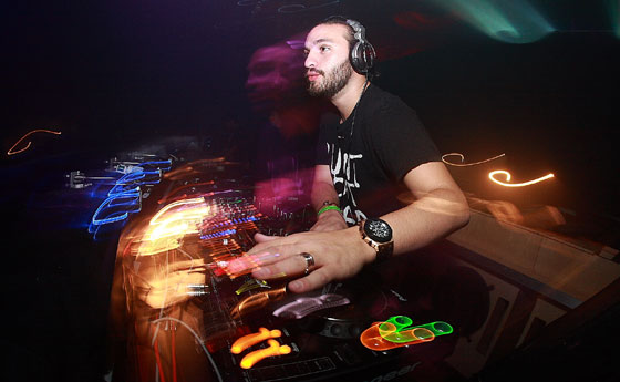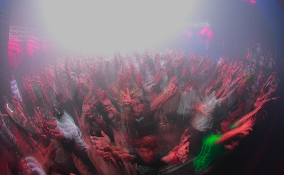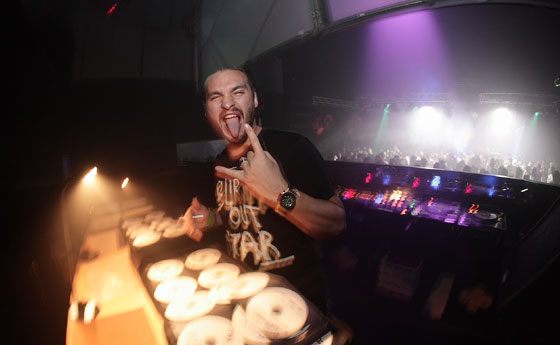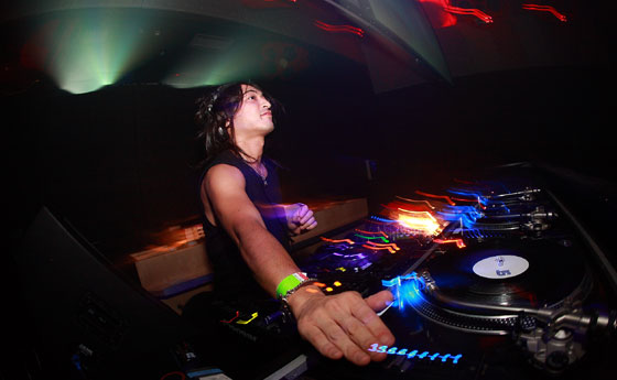 アリーナに到着するとすでに本人のプレイが始まっていたが、まだ序盤らしく、疾走感のあるトラックで軽快なサウンドを展開。観客を手であおりつつ楽しそうにプレイするそのスタイルは貫禄たっぷりで、まだ若干24歳には見えない存在感を放っていた。うなるようなベースラインに16分で刻むテッキーなハイハットが気持ちのいいグルーブを演出し、プレイは快調な滑り出しを見せたようだった。テッキーでありながら、ハウス的な雰囲気も多分に感じさせるサウンドで、筆者の個人的な印象としてはファンキーハウスの進化系といった感じ、人気の Great Stuff からリリースされた 'Bounce Baby' などしっかりとしたサウンドながらどことなくファンキーさも兼ね備えたような楽曲を中心に、楽曲の持つ起伏を上手く利用しながら少しずつビルドアップしてゆく安定感のあるプレイに筆者もそのプレイを楽しんだ。周囲の観客もそのしっかりとしたビートに導かれるように徐々に勢いを増してゆき、絶妙のタイミングで入るブレイクとそのブレイクから戻るときの低音の鳴りが気持ちよく、歓声も次第に大きくなっていった。抜けと戻りの構成を何度か繰り返し、十分にフロアのボルテージが上がったところでおそらく2分ほどはあろうかと思われるドラマチックなブレイクを持つ楽曲をプレイ、ブレイクに入り、少しずつ入ってくる音に、何度もブレイク後のはじけポイントを体験させられている観客は期待値もあがり、今か今かと待ち構えているような状態へ、来る、こない、来る、こない、来る、来る、来る、来たー!!ブレイクがあけた瞬間、ボルテージは最高潮へ、観客は狂喜乱舞で、あちらこちらで飛び跳ねる人も続出し、フロアはいよいよその勢いを増していった。 |