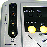 ■AUTO BEAT LOOP (オート・ビート・ループ) 再生中に左上1、2、3、4のいずれかのボタンを押すと、その時点から押したボタンのビート分を自動検出し、ループ再生を簡単に行える。さらに、再生中に LOOP IN ボタンを押しながら1、2、3、4のボタンを押すと、それぞれ1/8、1/4、1/2、1/1のオート・ビート・ループも行うことが可能。また、マニュアルでループを組んだ場合は、同じボタンで1/8、1/4、1/2、1/1と細かなループを組むこともできる。 |