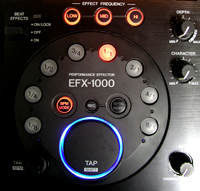 EFX-1000には大きく分けてBeat effectとdigital jog breakの2つのセクションがあり、質の違うエフェクトを同時にかけることができるというのがひとつの特徴である。エフェクトの組み合わせから生まれるパターンだけでも98種類、そこに自分で打ち込めるリズムという要素なども加わるため、使う人の個性でまったく違った表情が生まれるマシンである。 Beat effect、digital jog breakどちらのセクションもエフェクトの濃さや深さ、原音とエフェクト音とのバランスをDEPTHツマミとMIXツマミで調整できる。 以下にそれぞれのセクションが持つ、機能を紹介する。 |
