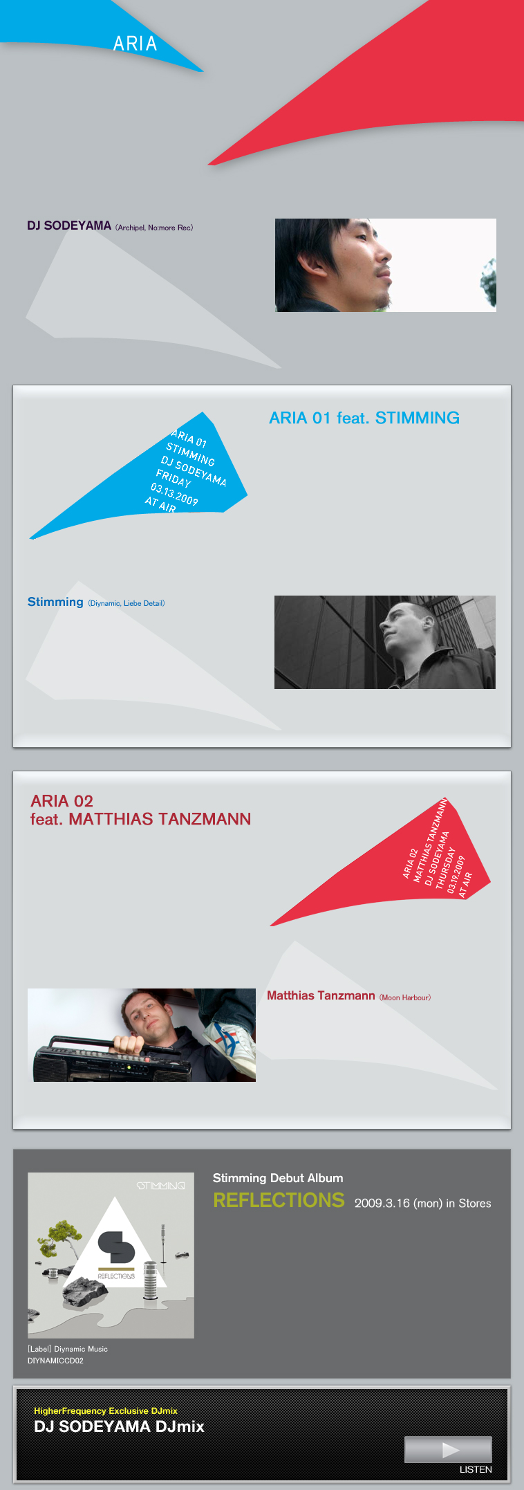 春先にAIRが仕掛けるニューパーティー "ARIA" 。DJ SODEYAMA をレジデントに迎え、この夜、注目のローンチを果たす。 2週連続で開催される "ARIA"。記念すべき第1回 3/13(Fri) にフィーチュアされるゲストは、今、世界中のクラブで主流となっている Tech House シーンの中で最も注目を集めているプロデューサー/リミキサー、Stimmingを迎え、翌週3/19(Thu)のゲストは今や世界のクラブミュージック・シーンの一大潮流となった German Tech / Click House を代表するレーベル Moon Harbour のオーナーにして 看板アーティストである Matthias Tanzmann を迎える。 どちらも要注目の見逃せないアクトを揃えてのスタートとなるこのパーティーを、是非あなたの五感で確かめてほしい。