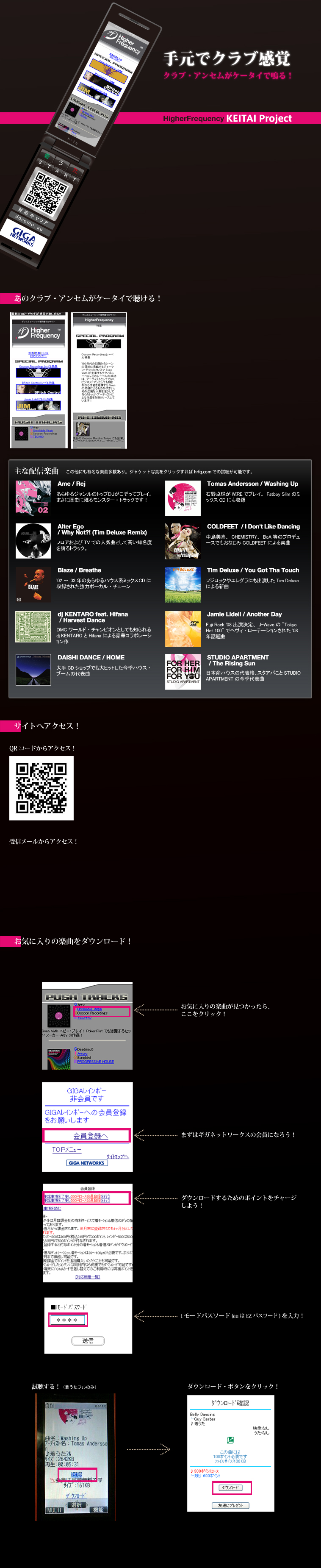 この携帯配信サイトでは、 HigherFrequency の姉妹サイト hrfq.com が持つ膨大な楽曲の中から厳選され