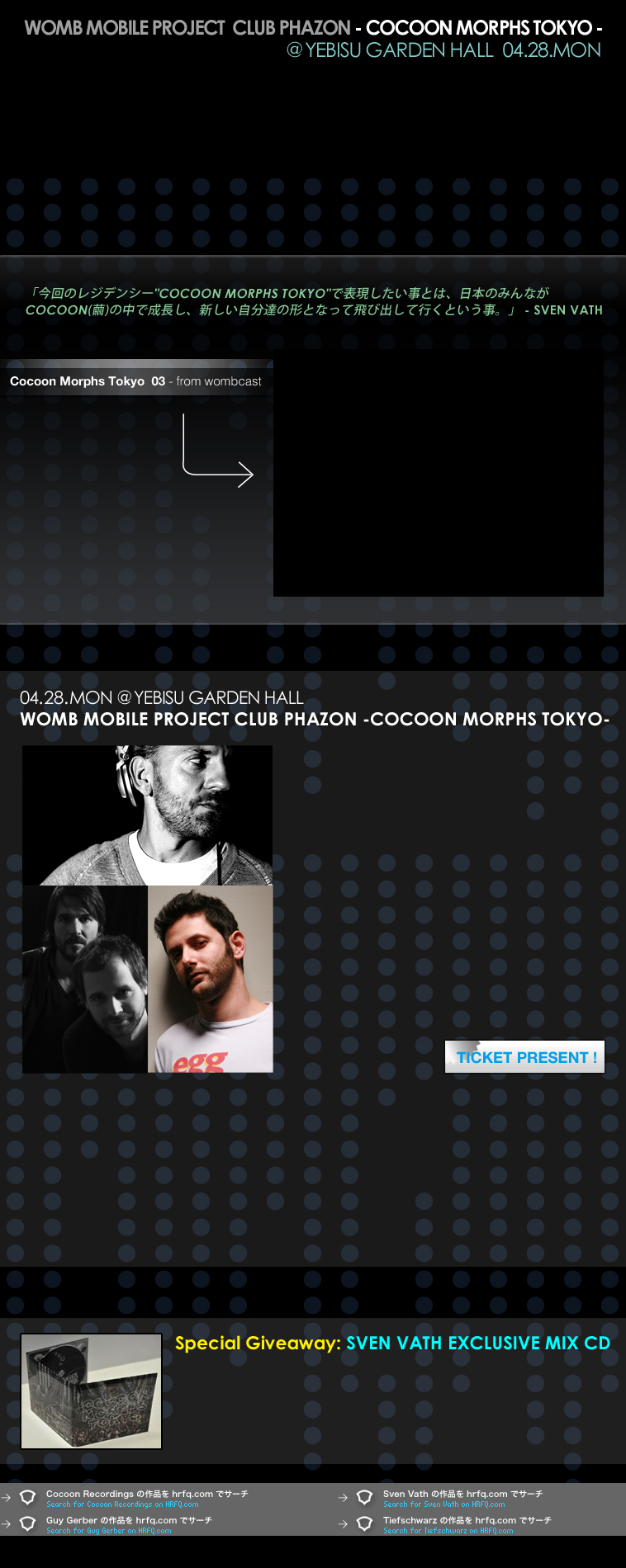 現代のライフ・スタイルには欠かせないファクター全てを彼独自のブランディングでミックスし、常に新しいカルチャーを生み続けるSvan Vath。彼の代名詞的アクティビティ "Cocoon" の全てを表現するにふさわしいアウトプットこそ、彼のオーガナイズする数々のパーティだ。地元ドイツ/フランクフルトの "Cocoon Club" ではもちろん、毎夏スペイン/イビサ島で開催される"Cocoon Club Ibiza" はあまりにも有名で、それらに続くCocoon のレジデントパーティが4月、ここ東京のWOMB、そして WOMB のモバイルプロジェクト "CLUB PHAZON" で開催されることが決定した。 Svenはもちろん、 Cocoon を代表するアーティスト陣に加え、世界的な写真家 Andreas Gursky 演出によるメイン・イメージなど、あまりに刺激的過ぎるファクターと、東京のエネルギーによって生まれる何か... それこそが "COCOON MORPHS TOKYO" である。