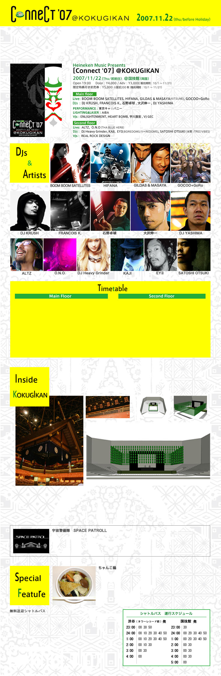 メインステージとなる場所は通常土俵があるアリーナ。土俵は実は可動で、床下に沈む。さらに土俵 を囲む枡席も、1/2ほど後方に収納することが出来る。すると約40メートル四方のスペースが現れ、そこをダンスフロアにするという設定。ちなみに相撲の場所中は土俵の上に吊るされている屋形だが [Connect'07]当日もこれは設置。また壁四方には歴代の横綱の絵がずらりと並べられ、当日照明とレーザーを担当するAiBAがこれを活かす演出を考案中とか・・・国技館という会場を多いに活用して「和」を演出する。