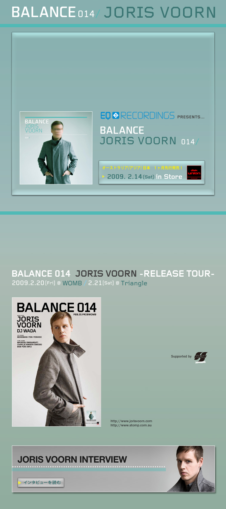 屋内最大級のテクノフェスティバル「Wire」への3年連続出演、さらに昨年夏の WOMB での Len Faki とのバック・トゥ・バックセットも記憶に新しい Joris Voorn が、自身の Mix CD としては4年ぶりとなる "Balance 014" を引っさげ、”Balance” リリースツアーと銘打って東京は WOMB、 大阪は Triangle と二都市を巡る抜かりなきスケジュールにて日本へと帰還する。オーソドックスで一貫性のあるオリジナルデトロイトテクノを彷彿とさせ、聴いた者にだれしもが長い間待ちわびていた音楽にたどり着いた喜びを噛み締める独特のスタイルを持ったテクノアーティスト・Joris Voorn のハイセンスなDJセットに注目が集まる。