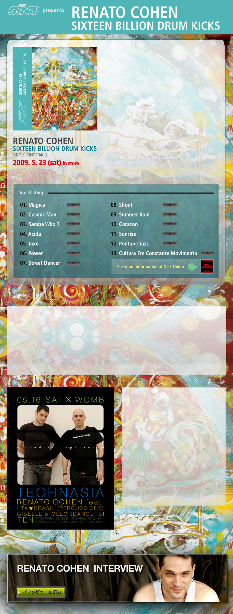 99年に Anderson Noise の Noise Music よりデビューを飾ったRenato Cohen は、2002年に Carl Cox のレーベル・Intec からリリースされた 'PONTAPE' が爆発的ヒットを記録、ワールドワイドにその名を轟かせること となる。その後も寡作ながら本アルバムのリリース元でもある Technasia 主宰・Sino から数枚の12インチを発表、ブラジルを代表するテクノ・アーティストとなった。チリから飛び出したRicardo Villalobos や Luciano とはまた 違った形で南米の底知れぬ力を見せ付けてくれた存在だ。また、Wire 08 をはじめ過去数回に渡り来日公演を行っており、ここ日本でも高い人気を獲得 している。 本作 "16 billion Drum Kicks" は、彼の地元であるサンパウロで録音され、 パリにある Technasia のスタジオでミックス/エディット、さらに伝説のスタジオ “Translab” にてマスタリングを施すなど、完成までに2年の月日をかけて 制作された入魂の作品! 先行で12インチカットされている冒頭の 'Magica' での鮮烈なヴォーカル・ループと粘っこいベースラインに象徴されるように、ファンク、ディスコ、ジャズ、そしてブラジリアン・ミュージックの要素がそこかしこに散りばめられた、まさに Renato Cohen でしか作り得ないオリジナリティー溢れるテクノ・トラックが13曲詰め込まれている。Technasia はもちろん、Marku Ribas、Bocato、New Samba Jazz といったブラジリアン・ミュージシャンも多数フィーチャーしたバラエティーに富んだ仕上がりは、従来のファンに留まらない幅広いテクノリスナーに対して強烈にアピールするだろう。テクノ本来が持つパワーをまざまざと見せ付けてくれる力強いトラックに打ちのめされること必至の傑作!