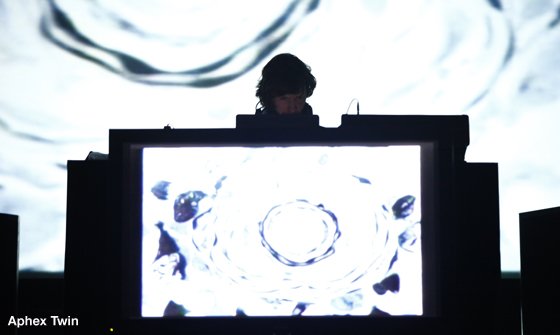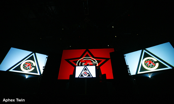 そして、お待ちかねの Aphex Twin !!!!! 今回の来日については、皆喜ぶとともに誰しもが耳を疑ったのではないだろうか。そして、本当に当日ステージに立ってくれるのだろうかと心配した人も少なくはないはずだ。音楽性はもちろんの事、数々の伝説、逸話がある事で知られる彼。来日が発表されてから変な不安と期待でこの日を待ち望んだ。ライブが始まる直前には溢れるほどオーディエンスが押し寄せ、改めて人気の高さを実感。そうもしているとステージ上に設置された4台のモニターに何やら不気味なメッセージが映し出され、そのメッセージが消えたと共に本格的にライブがはじまった。 最初はブレイクビーツ寄りな選曲に時折スクラッチ音が入るなど、映像共にクールな 「らしい」 雰囲気で始まった。途中、6月に亡くなった Michael Jackson の 'Rock with You' キラキラ・エディット・バージョンが流れ、これまでのイメージに無かったので少し驚いたが、良い意味で期待を裏切る、予想を上回ることをやってくれるのが何とも彼らしいとしみじみ実感。そして気付いた時にはどっぷりと彼の世界へとハメられてしまっていた。 自身の顔をぐちゃぐちゃに弄ったり分解しているような映像から、奇怪とも言える不思議な静止画に3Dエフェクトをかけたアシッド感満載な映像が、徐々に加速する不規則なビートと相まってどこかの最終地点へ向かっているかのように繰り広げられていた。興奮も絶頂へ着た終盤、思わず目を賦せてしまいたくなるようなグロテスクな映像が展開され、最後には到底書くことのできないような 「こんなのアリ!?」 というオチで終結。最後まで気を抜くことを全く許さない、あっという間の1時間であった。 | |