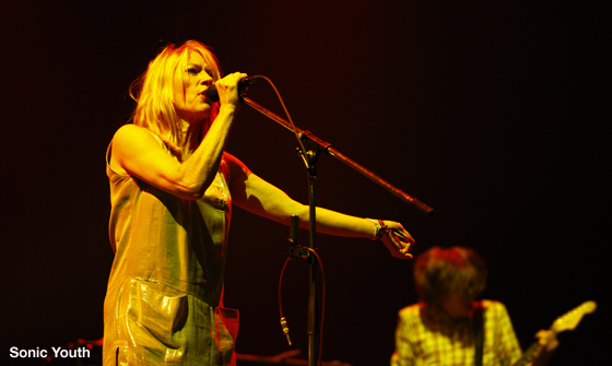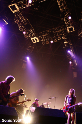 再度 Sonic Stage に戻り、3日目の筆者の個人的な目玉、Sonic Youth のライブへ。80年代から活躍する大ベテランであり、実験精神溢れる真の意味での 「オルタナティブ」 を体現する Sonic Youth。10年前の Summer Sonic 第一回でのライブも伝説として語られる彼らだが、全く年月を感じさせない格好良さでステージに登場した。当時から未だに筆者憧れの夫婦である Thurston Moore・Kim Gordon 夫妻を目の当たりにし、言葉にならない感激が全身を駆け巡る。肝心のサウンドも、ベテランでありながらカケラほども丸みを帯びる気配もない素晴らしい好き勝手放題ぶりで、期待を全く裏切らない!唄やサビ部分ではなく、雰囲気とノイズでもっていくような Thurston の変態ギターソロのタイミングでクラウドが盛り上がるノリが、筆者の中では不思議なことに普段エレクトロニック・ミュージックを聴いているときの感覚や、音像の見え方に非常に近く感じられた。歌詞やメロディの存在を前提とせず、「音」 そのものを楽しむことを目的に作られた音楽という共通点があるからだろうか? ライブのクライマックスと同時に震度4の地震があったことを後から知ったのだが、その時はちょうど、Thurston がアンプの上に上ったり、マイクスタンドを客席に放り投げるという若手バンドもびっくりの暴れっぷりを見せていたので、筆者含め、恐らく Sonic Stage では誰も地震に気付いていなかったと思われる(笑)。 | |