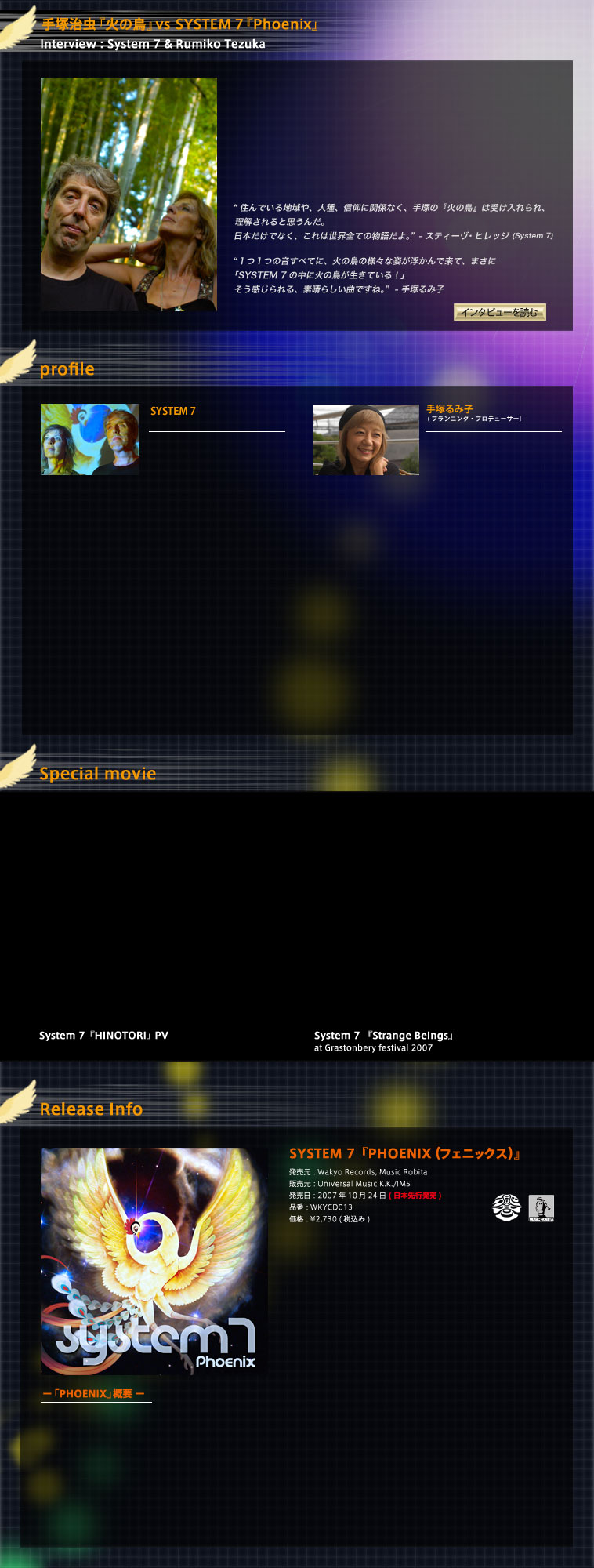 『MYSTERIOUS TRAVELLER』をリリースし、日本でのライヴパフォーマンスとしては、広島・厳島神社で行われた『世界聖なる音楽祭』TOKIO DROME、武尊祭などで99年から02年まで毎年コンスタントに来日を果たしており、その時空を超えたパフォーマンスで若い世代からの支持も確実に増やし続けている。そして04年秋にはSYSTEM 7待望のニューアルバム『ENCANTADO』をリリース、昨年には新アンビエント・ユニット『MIRROR SYSTEM』としてアルバムを発表するなど、その活動は絶え間なく続いている。
