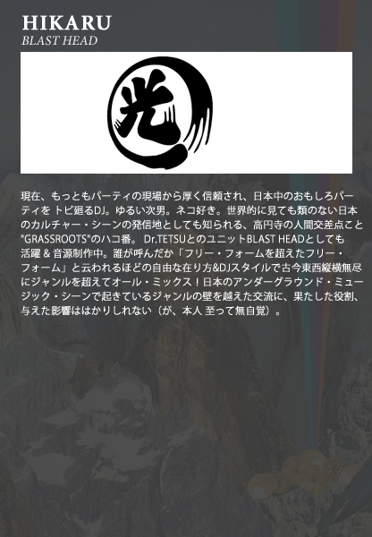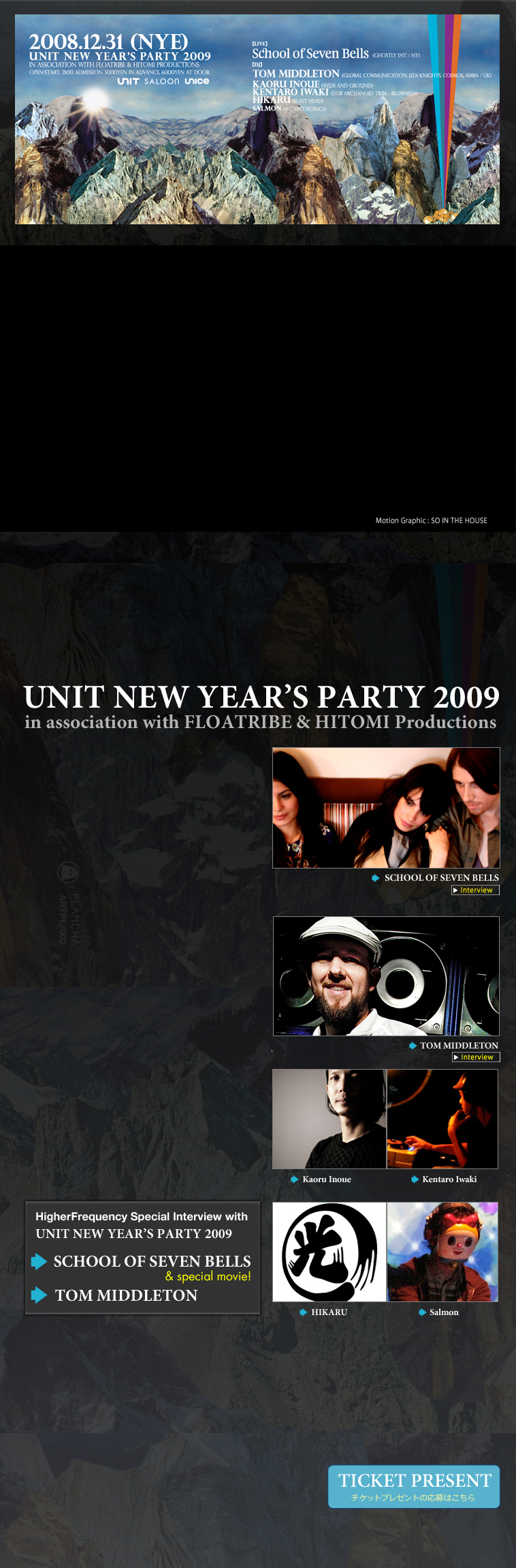 さらには、UNITのレギュラー・パーティー"FLOATRIBE"からKaoru Inoue、Kentaro Iwaki、そして高円寺の人間交差点"GRASSROOTS"のハコ番HIKARU、WC Recordings主宰/WC@UNITのレジデントDJのSALMON、そのほか国内著名DJ/VJ陣が、新年の幕開けにふさわしい最高の音楽・映像・空間を創造する!
