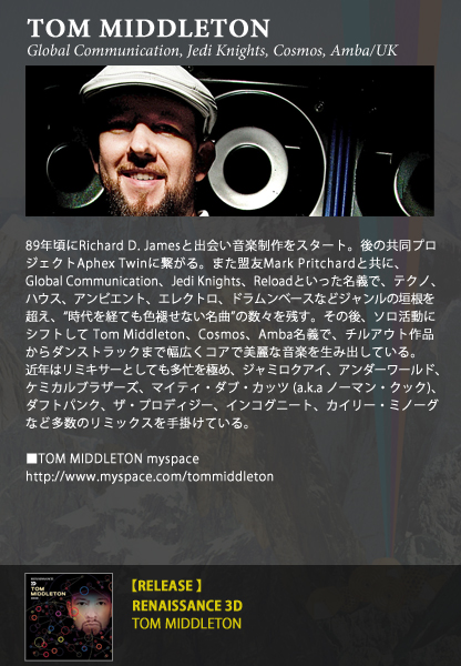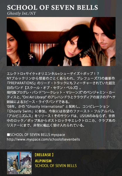 まずは、NYから超新星バンド"SCHOOL OF SEVEN BELLS"。あのPrefuse73とのコラボレーションでシーンにその名を知らしめ、今秋に1stアルバムをリリースし、M83とワールドツアーも敢行する。シューゲイズなギターと双子姉妹の神秘的なツイン・ヴォーカルを核に、エレクトロニクスとオリエンタリズムを奇跡的なバランスで融合したLIVEパフォーマンスが世界中で絶賛された。そんな彼らの日本初ライヴは超必見!!そしてロンドンから、様々なユニット名義やソロでのリリースで知られ、DJとしてもイビサ島をはじめとするヨーロッパ、アメリカ、そしてここ日本でも人気の巨匠"TOM MIDDLETON"の出演が緊急決定!!