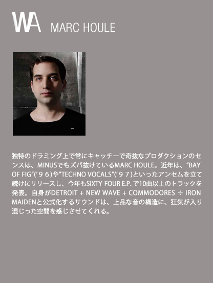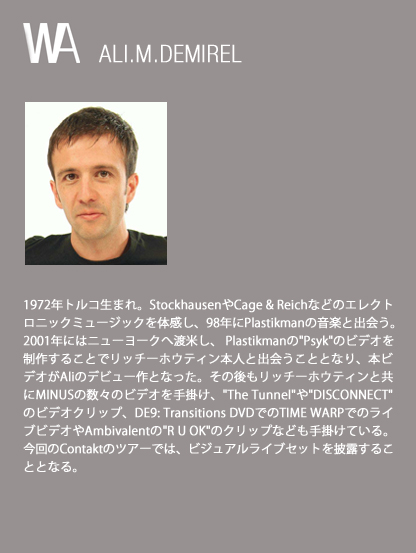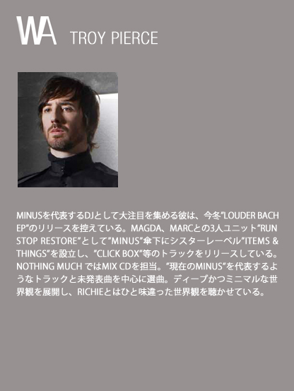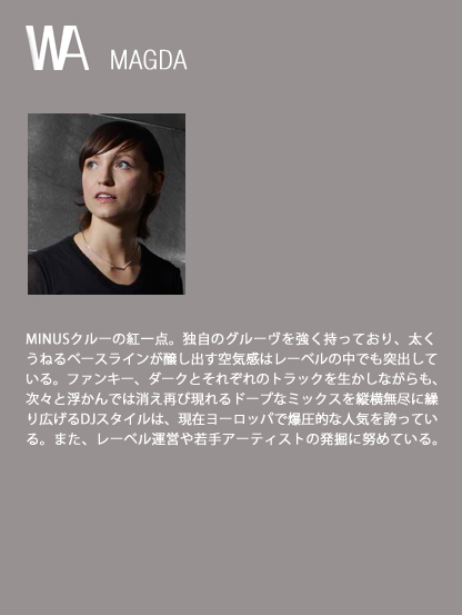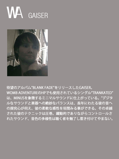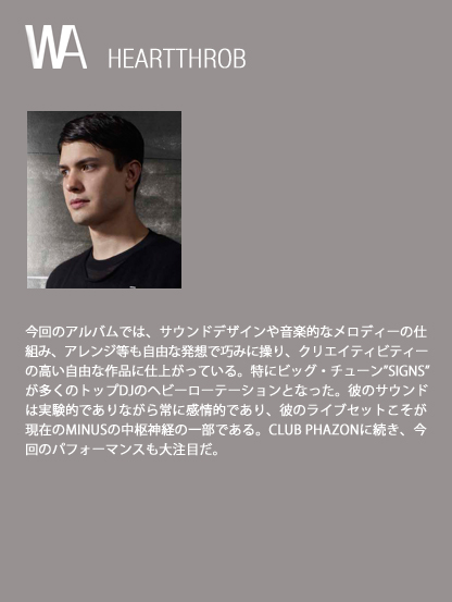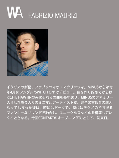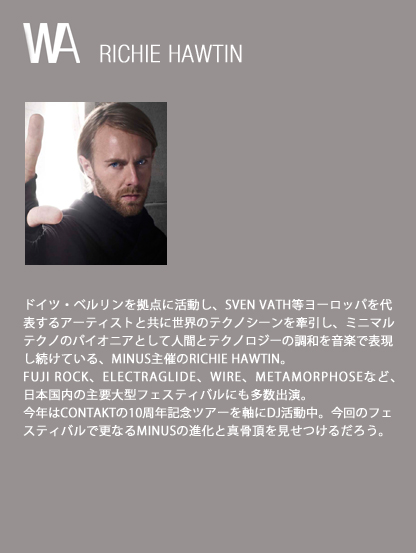 STEVE DASH監修のMOBILE INTEGRAL SOUNDSをインストールするWOMB WORLD WIDE AREAでは、世界基準の特別なショーケースをお届 けする。ドイツ・ベルリンを拠点に活動する、NO.1テクノレーベル“MINUS”10周年を記念した、世界を巡るツアー“CONTAKT”のファイナルショー ケースを開催。10周年を迎えた、まさに”MINUS”の集大成とも言える世界規模の貴重なショーケース。ダンスミュージック、テクノロジー界のカリ スマRICHIE HAWTINの全貌を目撃しよう。
