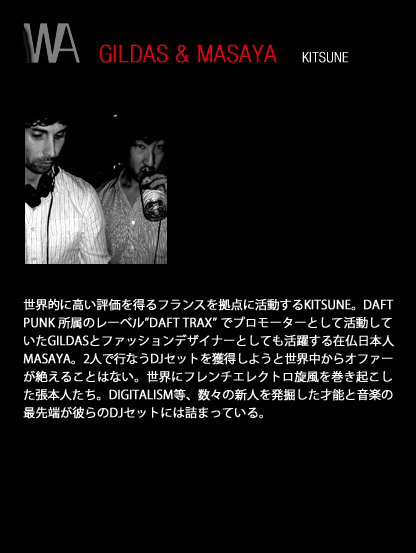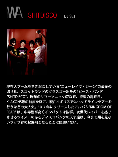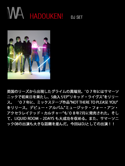 DJ: Hadouken!(dj set), Shitdisco(dj set), Gildas & Masaya(Kitsune), Shinichi Osawa, Dexpistols, and more.