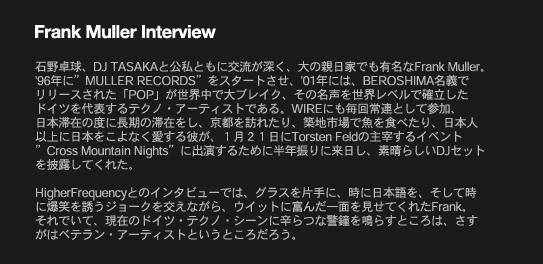CROSS MOUNTAIN NIGHTS feat. FRANK MULLER a.k.a BEROSHIMA with Dr.SHINGO (LIVE) @ WOMB, TOKYO パーティーレポート (2005/01/21)