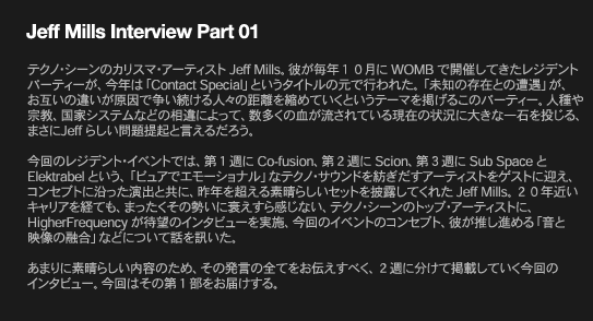 特集 : Contact Special 05 Jeff Mills バイオグラフィー パーティーレポート : Contact Special 2005 @ WOMB (2005/10/14-21-28) リリース情報 : Jeff Mills / Contact Special (2005/10/05)