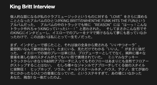 パーティー・レポート : An Intimate Evening with King Britt @ Space Lab Yellow (2005/02/18) パーティー・レポート : Konnected feat.King Britt @ Canvas, London (2005/03/05)